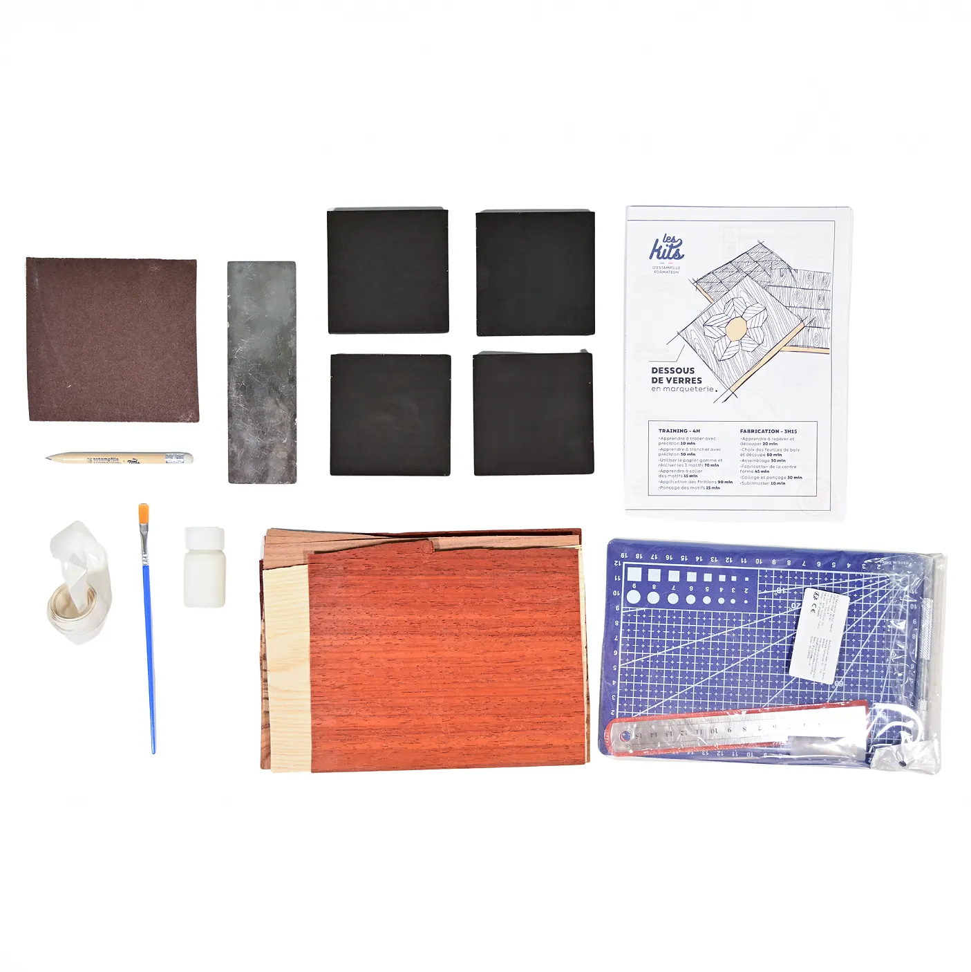 La technique principale transmise par ce kit repose sur la découpe et le collage de placages de bois. Grâce au tranchet, l’utilisateur apprend à découper avec soin les motifs, puis à les assembler à l’aide du scotch à marqueter pour maintenir les pièces en place avant collage. Le racloir et le papier de verre viennent ensuite parfaire les finitions, pour obtenir une surface nette et agréable au toucher. Au fil de l’exercice, l’apprenant gagne en dextérité et découvre l’un des savoir-faire fondamentaux de l’ébénisterie : donner vie à un motif en mariant les nuances naturelles du bois.
